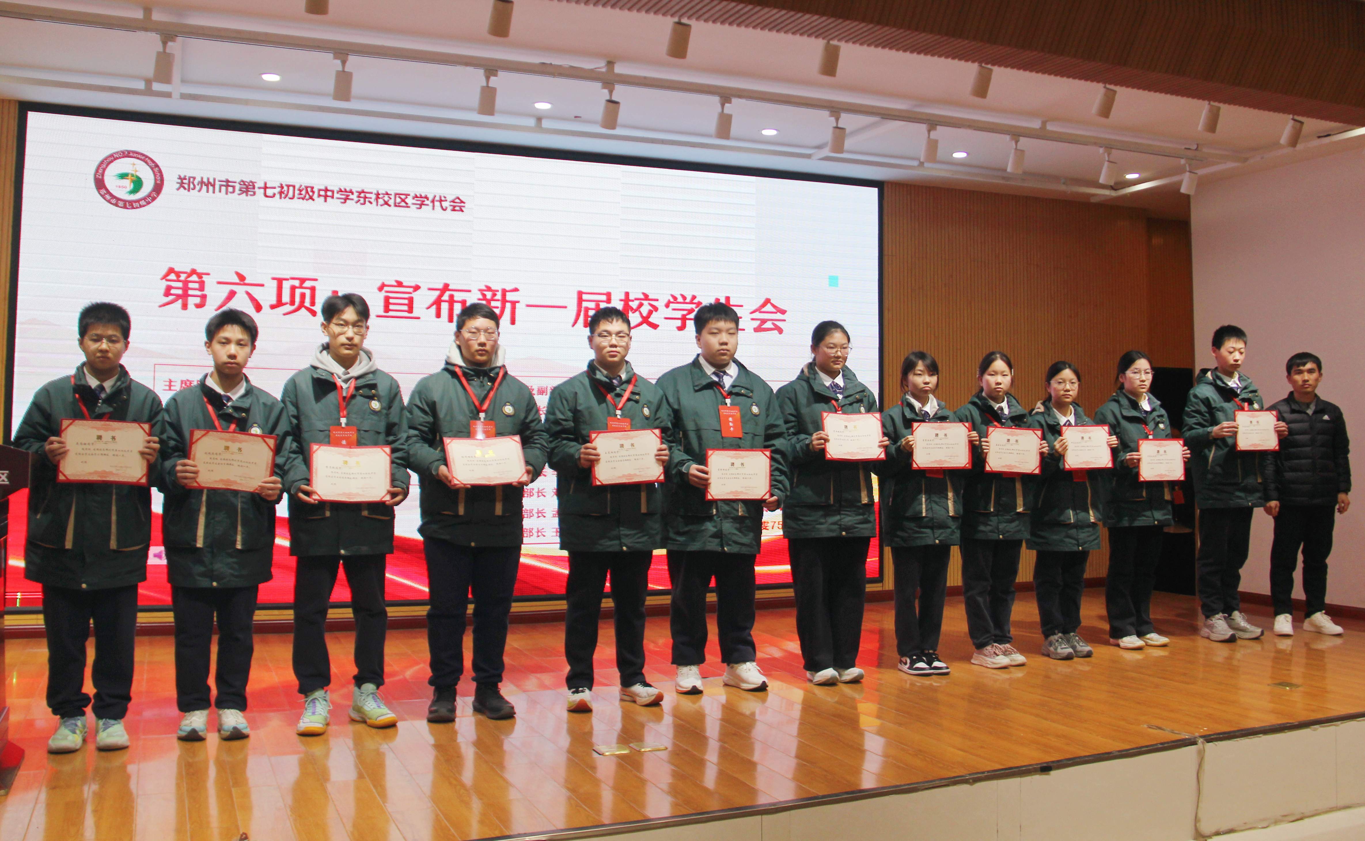 冬日和煦,青春激扬。1月14日,郑州市第七初级中学东校区第一届学生代表大会在报告厅隆重召开。校领导、教师代表与各班级学生代表齐聚一堂,共商学校发展。会议由八年级学生邱昱菡、宋波奕主持。