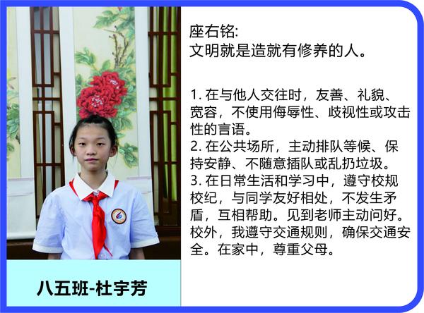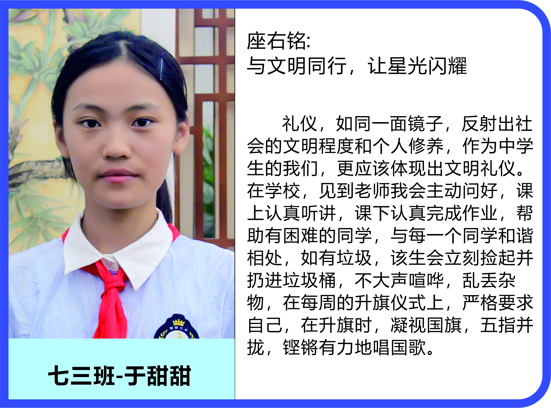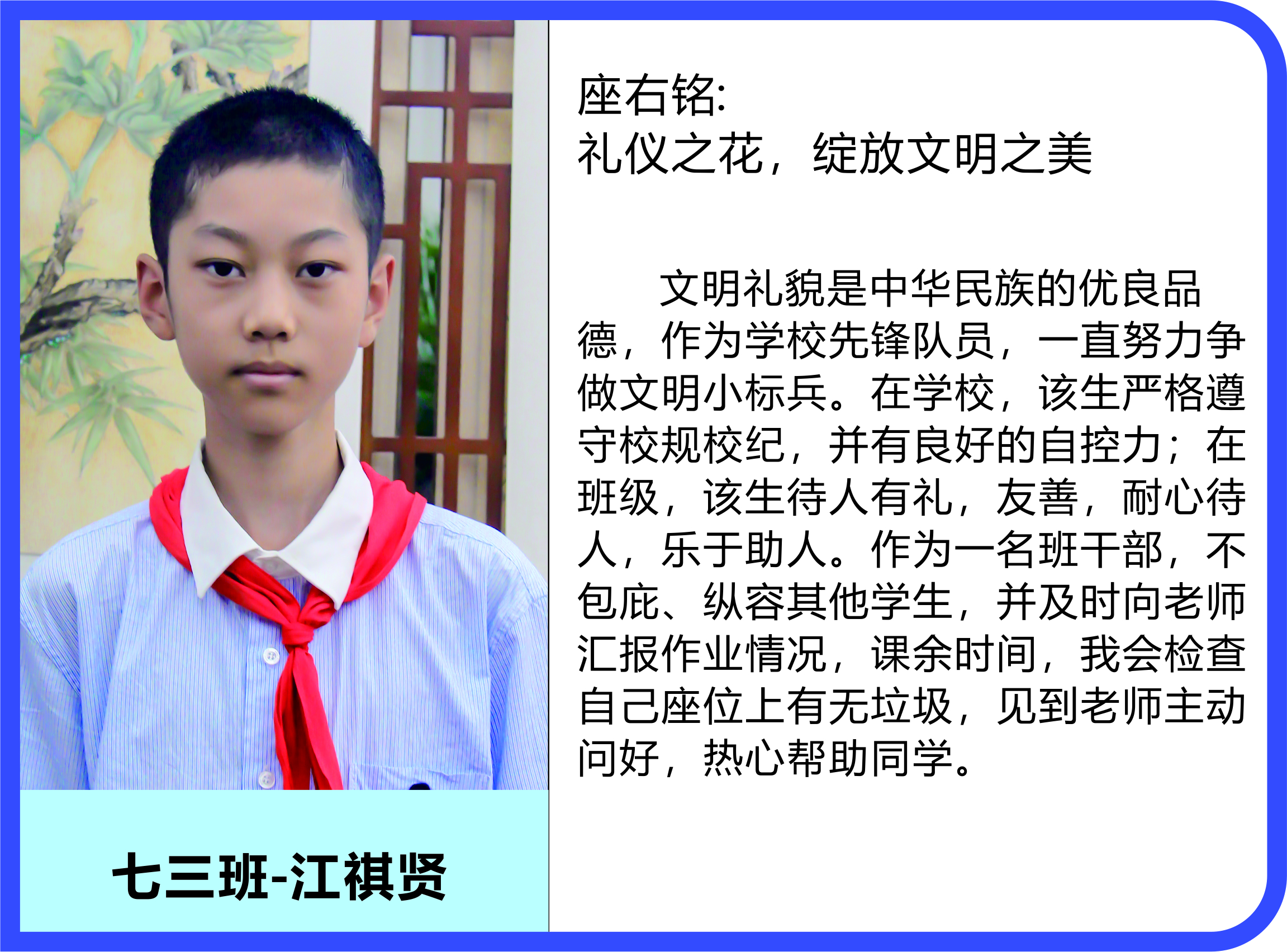 3月的德育主题是文明,我们开展了学雷锋志愿活动,文明礼仪黑板报、文明用语等相关活动,你们能够积极的参与活动,规范自身仪容仪表,用实际行动践行文明礼仪。经个人申报,班级推荐,学校审核,评选出本期《文明之星》。