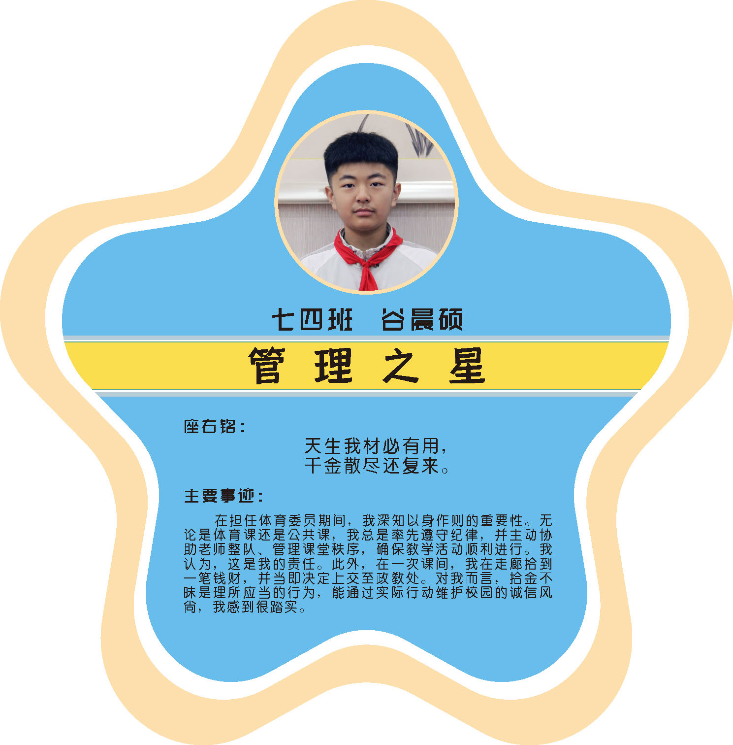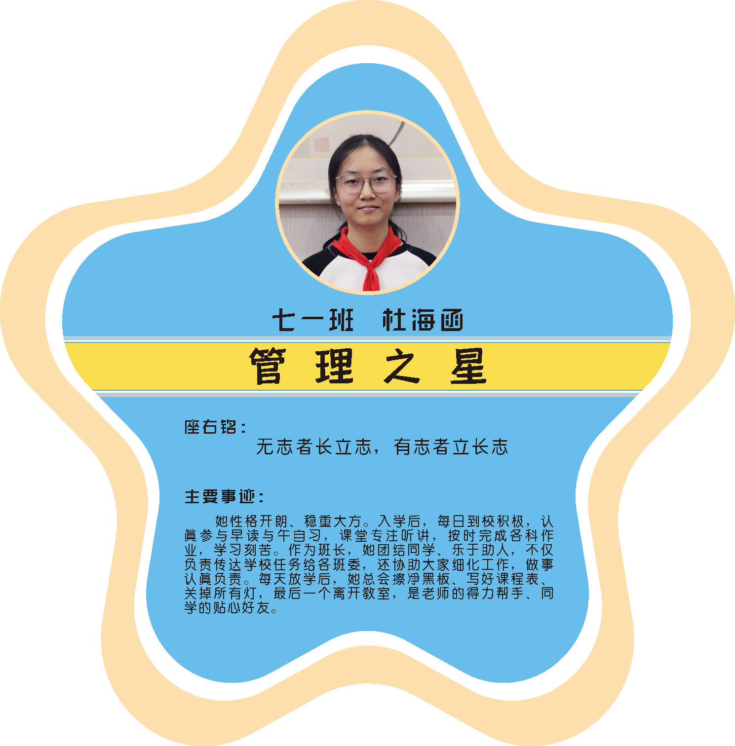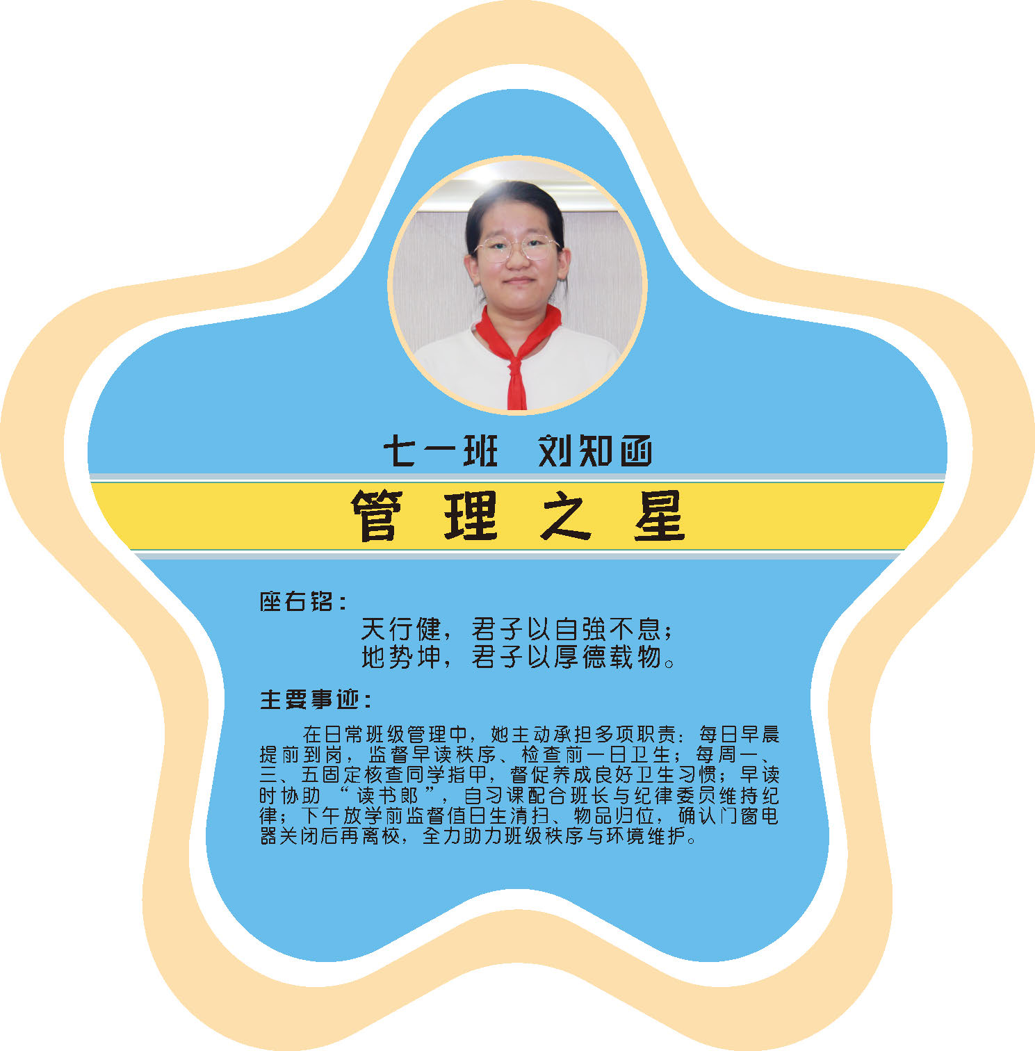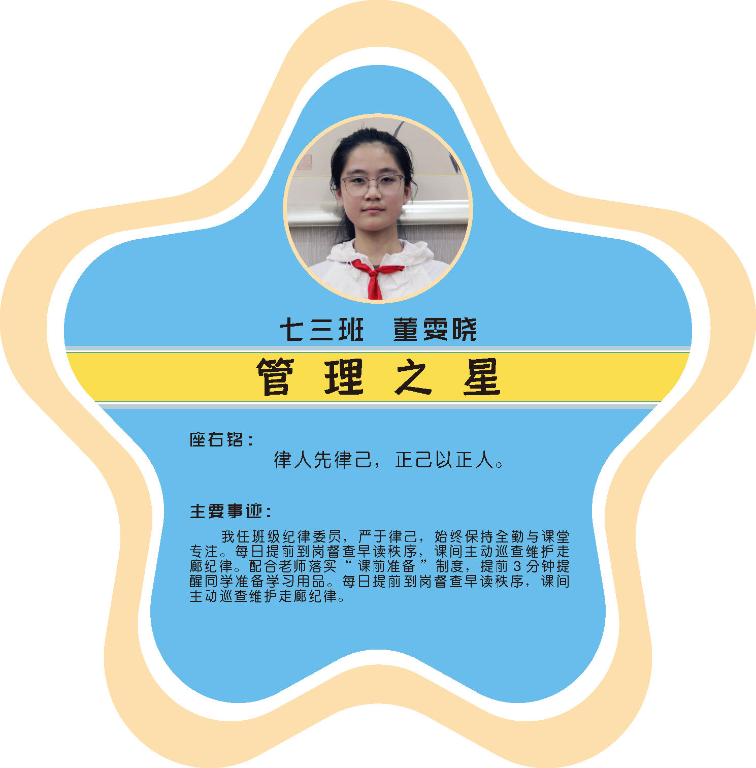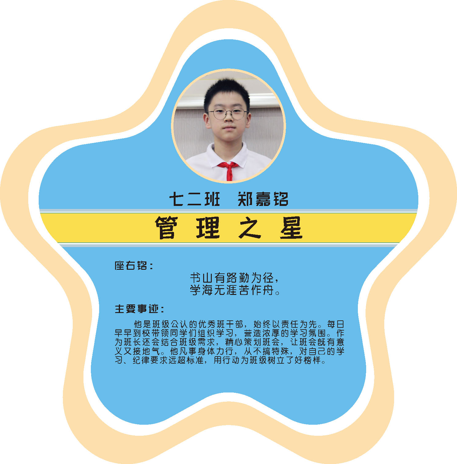 本期校园之星主题为“点亮平凡生活的微光”,他们或许来自不同年级,却同样以行动点亮平凡日常。结合学生日常行为表现,评选出年级之星、学习之星、勤奋之星、管理之星、自律之星、志愿服务之星、文艺之星、劳动之星、纪律之星。这些来自校园各领域的‘微光’,汇聚成榜样的星河,这就是本期校园之星们。