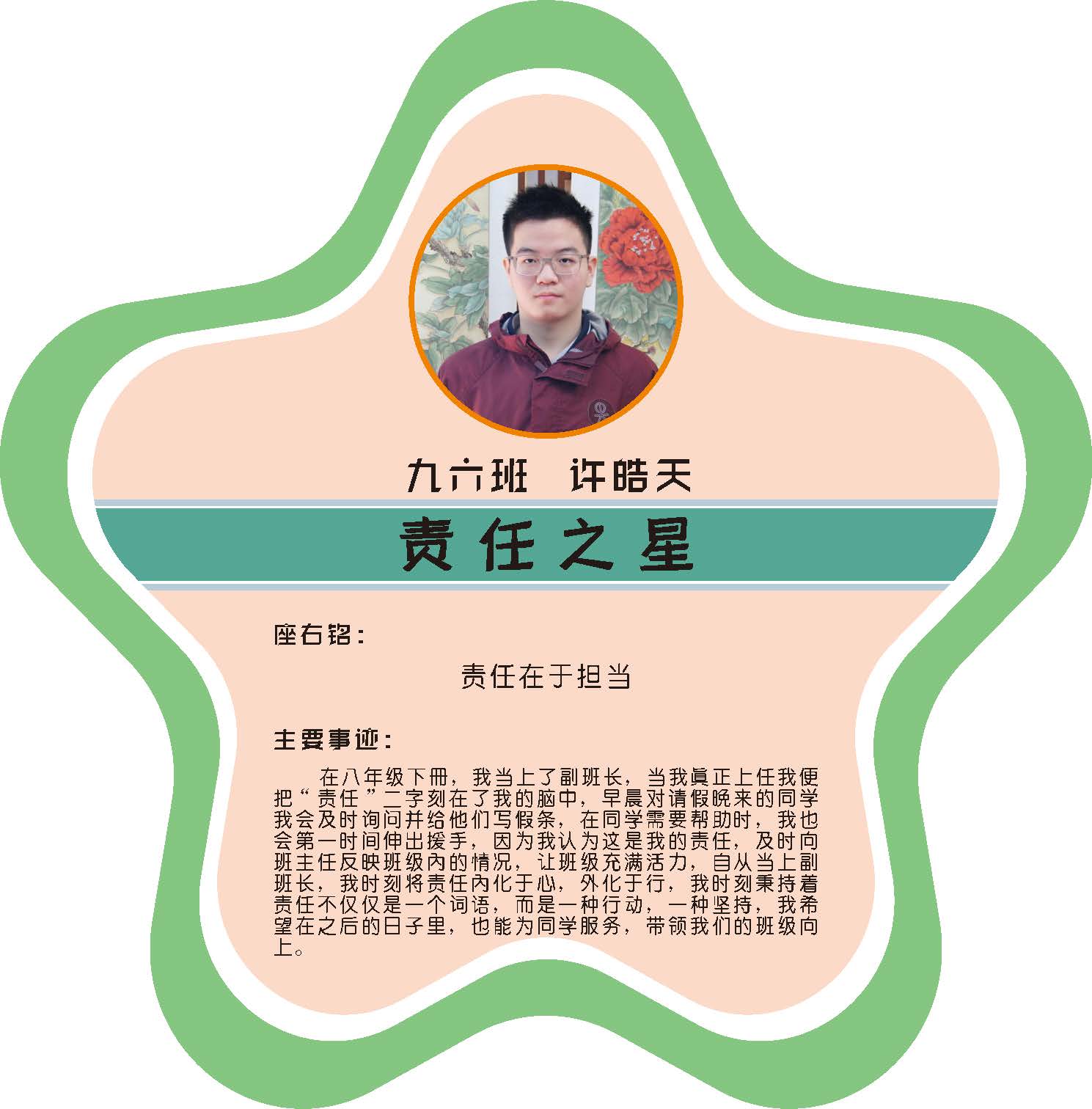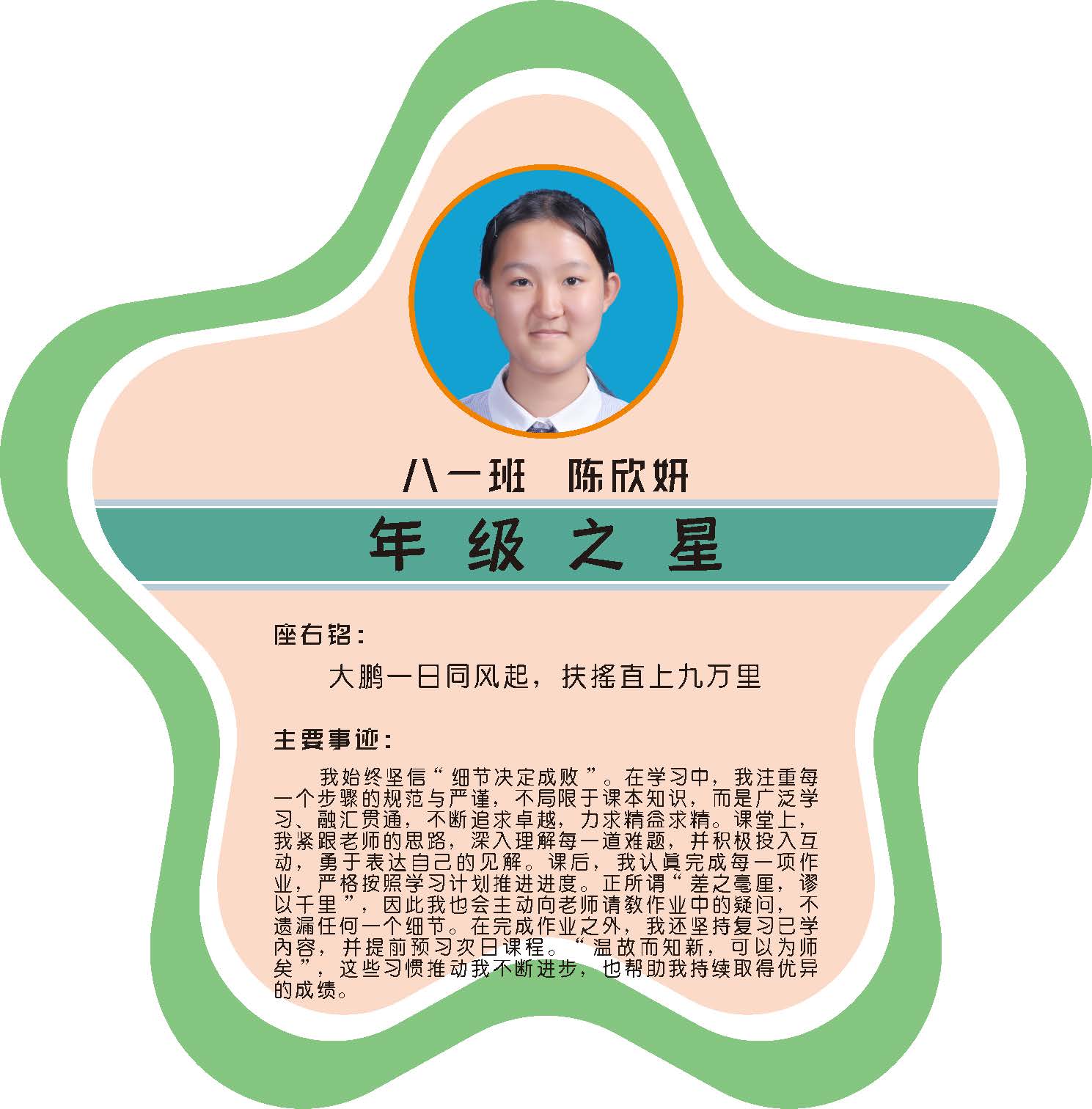 本期的校园之星主题为“让责任在行动中闪光”。他们以行动践行责任,用担当点亮校园。课堂上勤学善思;集体中主动作为;活动中勇挑重担。从班级事务到校园服务,从互助同行到志愿奉献,他们让责任扎根日常、让行动成就价值,用青春力量诠释担当意义!