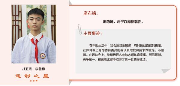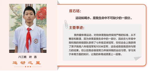 他们在运动会期间为班级争光,奔跑在运动场上,他们认真做眼保健操,大课间整齐跑步,口号响亮,经个人申报,班级推荐,学校审核评选出本期《运动之星》。