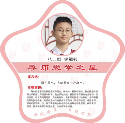 4月是学校感恩月,各班级开展学会感恩、班主任带给我们的感动主题板报、征文、尊敬师长、遵守纪律、主动问好、心存感恩。活动中同学们将感恩活动落实到日常生活中。经个人申报,班级推荐,学校审核,评选出2021年第二期《尊师爱学之星》。