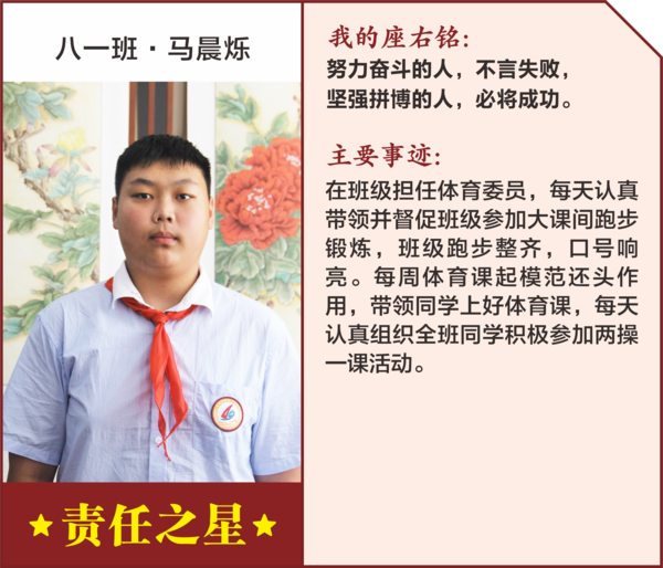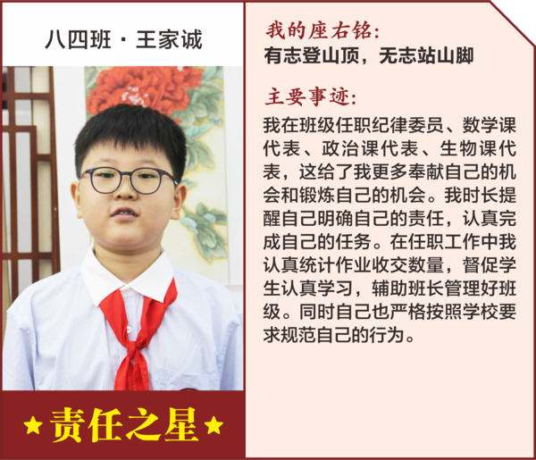 他们用自己力所能及的方式,尽职尽责,他们关心集体,乐于奉献,对小组、班级、家庭、学校积极负责。他们有班干部、小组长、课代表,还有优秀同学代表,都为文明班级建设,默默的贡献自己的力量。经个人申报,班级推荐,学校审核,评选出本期《责任之星》。