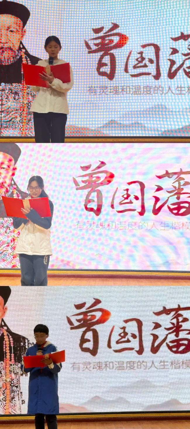 七年级六班的同学们以情景剧的形式生动演绎了“曾国藩勤字法”,将古人勤学励志的精神融入鲜活的表演之中,赢得了全场阵阵掌声。班级代表随后上台分享学习心得,从经典中汲取成长力量,让“勤能补拙”的理念深入人心。