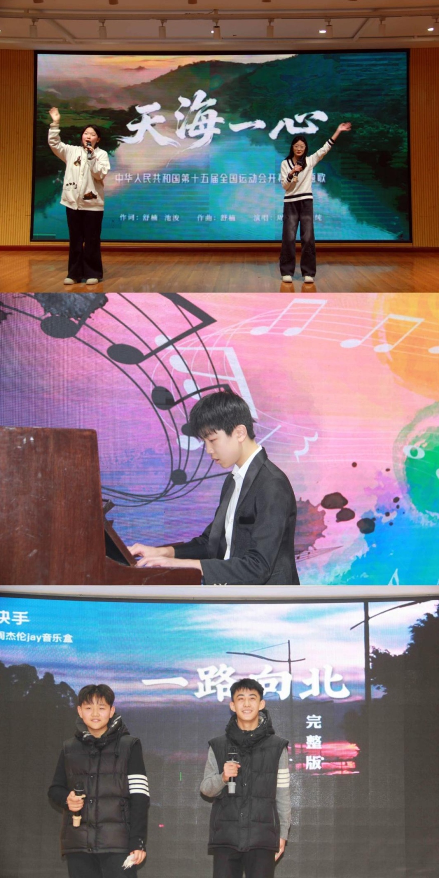 七三班《剑起别姬·曲落神话情》将京胡与舞剑完美融合;三班、四班联袂演绎《天海一心》;七六班钢琴独奏旋律悠扬;歌曲《青花瓷》《一路向北》《麒麟》、魔方竞速、舞蹈串烧等节目精彩纷呈,台下欢呼声、喝彩声此起彼伏!