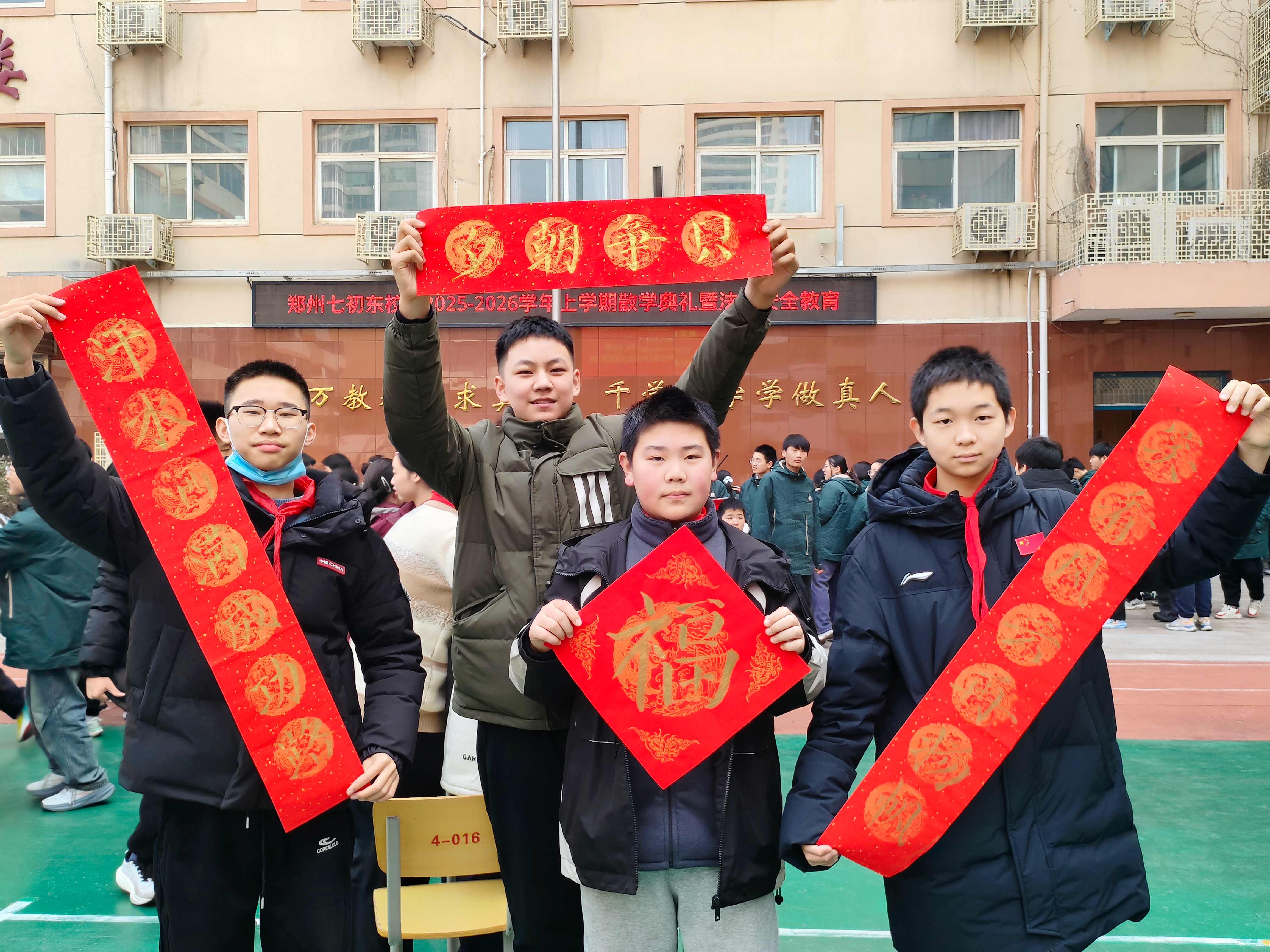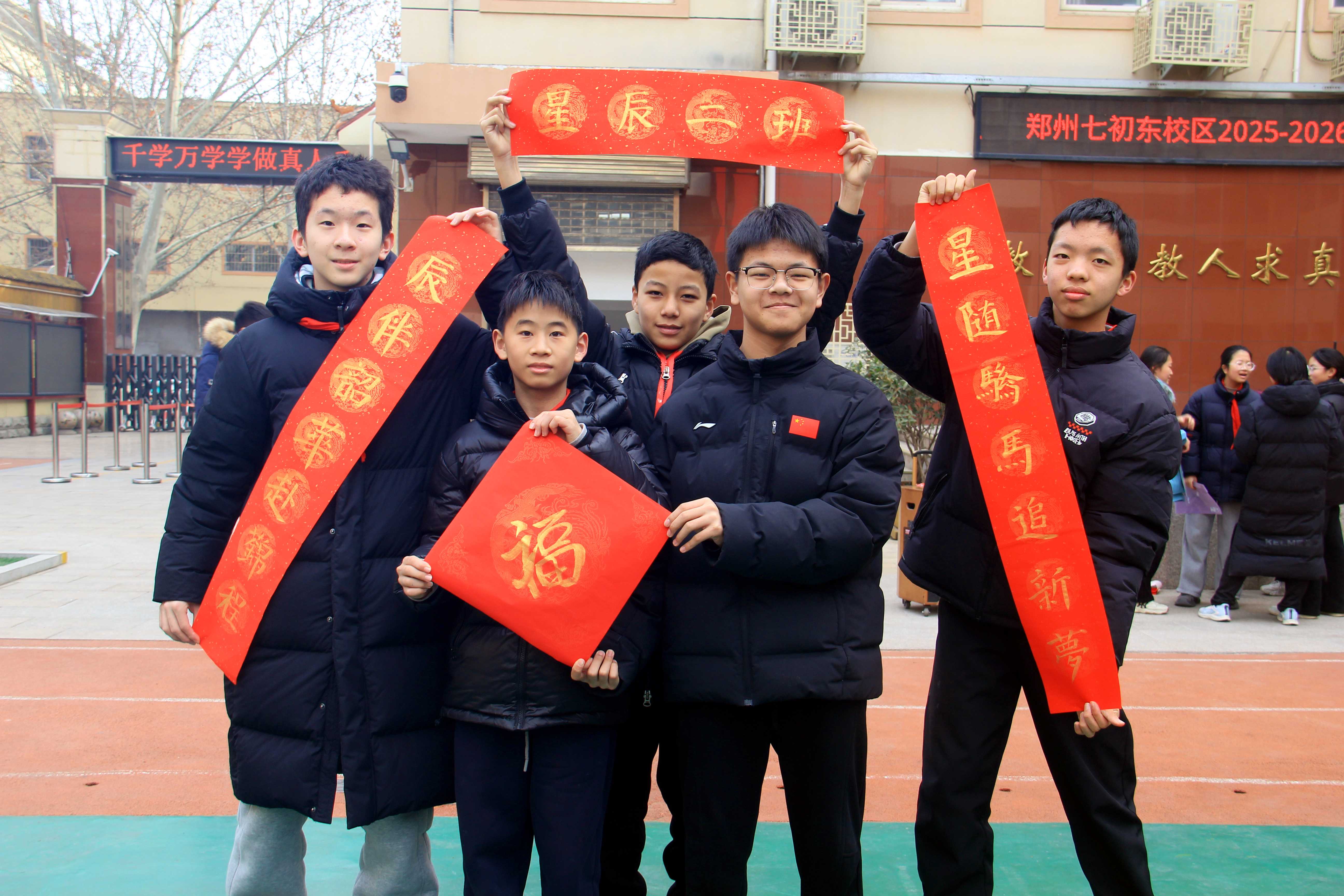 2月4日上午,郑州市第七初级中学东校区举行班级春联书写展示活动,来自各班级的学生代表齐聚操场,挥毫泼墨,迎接2026年农历马年新春,为校园增添了浓厚的传统文化气息。