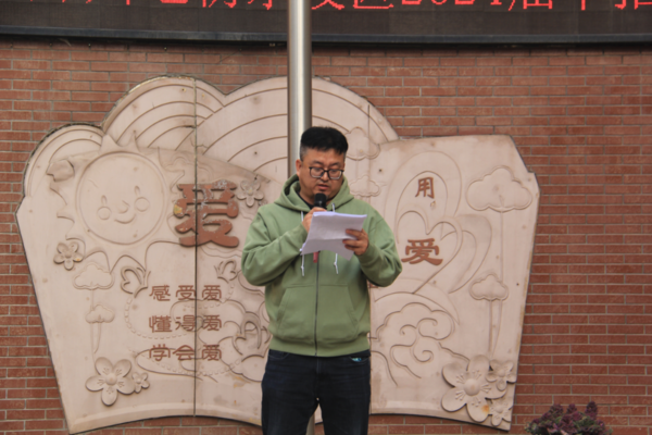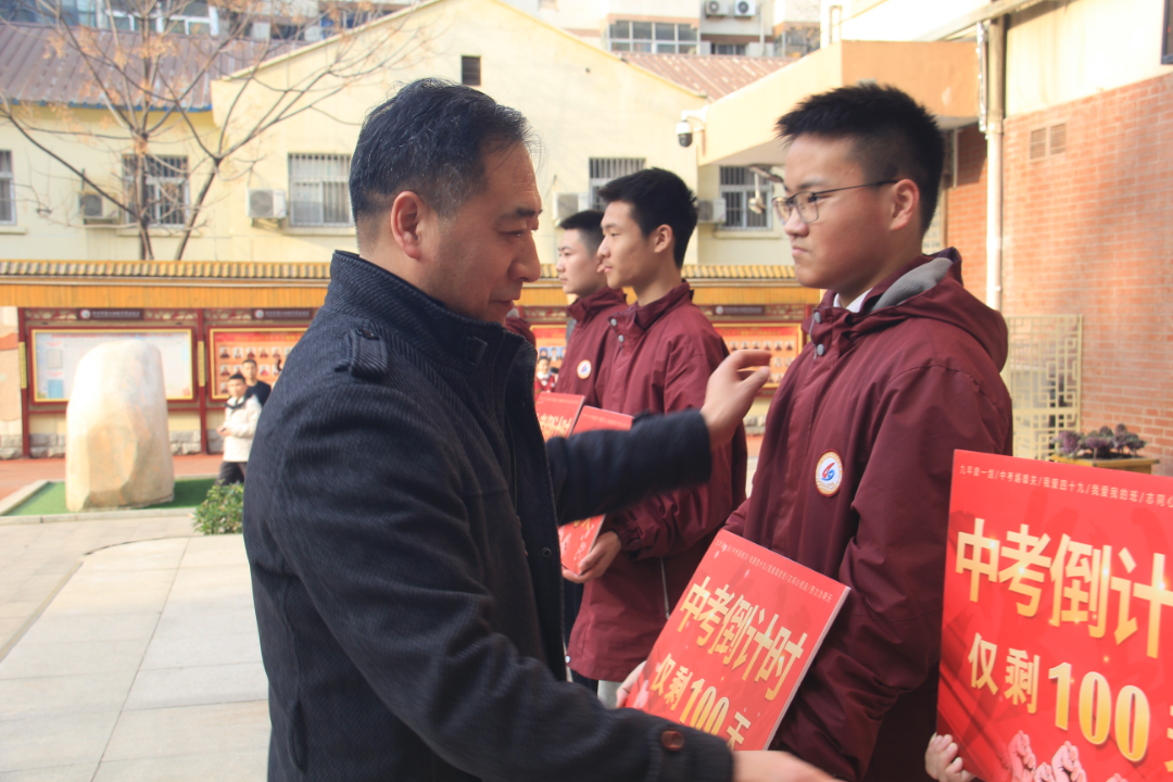 最后,郑州市第七初级中学东校区党支部书记楚东升致辞。楚书记要求同学们要有明确的目标、必胜的信心、积极乐观的心态,此外,楚书记还跟同学们分享了崔彤100天唤醒植物人爸爸的事迹,强调坚持的重要性。“道阻且长,行则将至,行而不辍,未来可期”,楚书记勉励即将走向中考战场的九年级学子,要充实地度过100天中的每一天,用汗水谱写母校的新篇章!