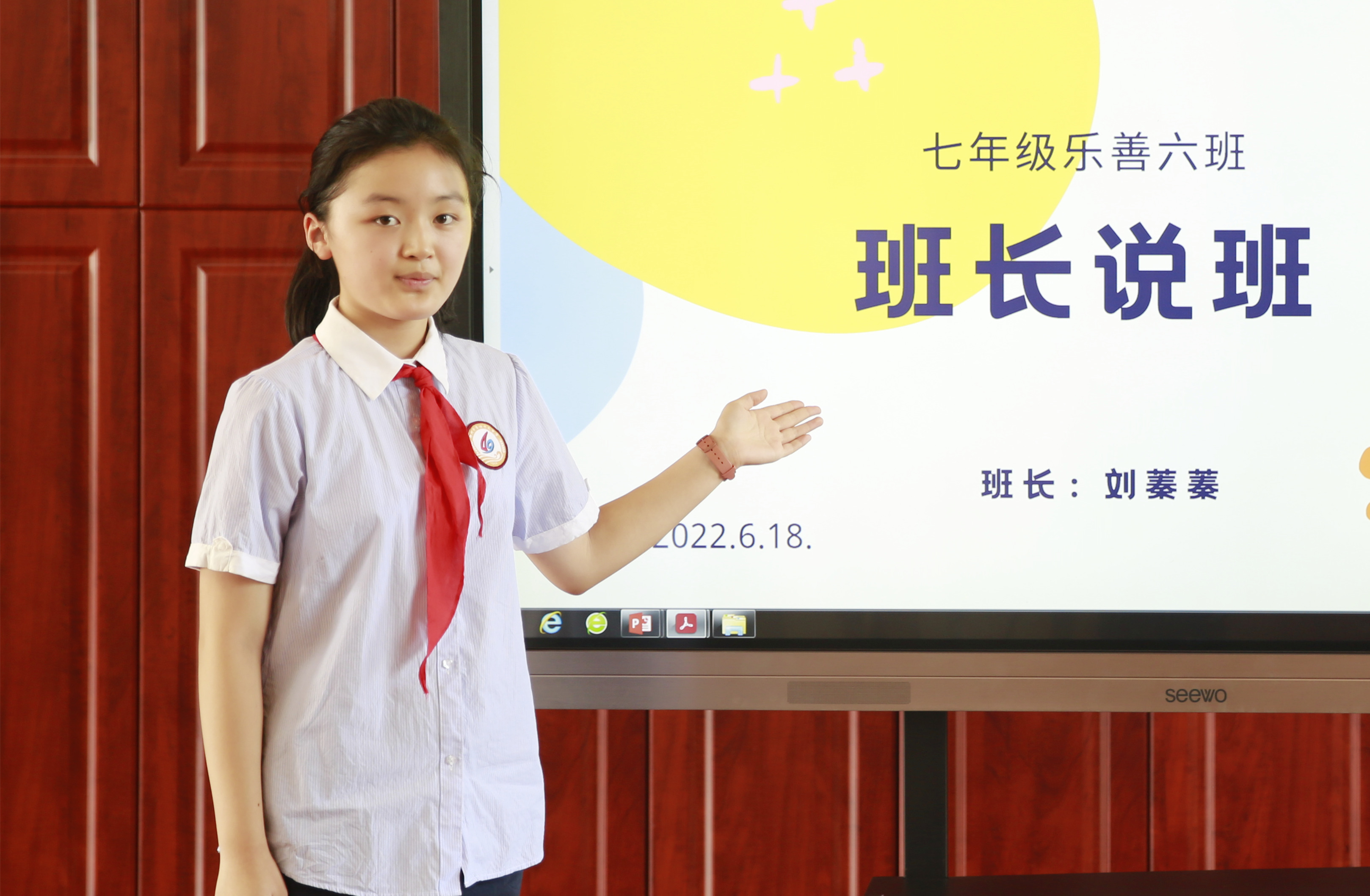 随后,七、八年级各班班长进行说班展示,总结一学期来班级文化建设、书香班级建设、班级活动的开展、学生个性特长展示等。“班长说班”活动,让师生以直观的形式总结班级建设亮点,进行自我认识和反思,同时也加强师生集体荣誉感,积极地为班级服务,增加班级凝聚力。