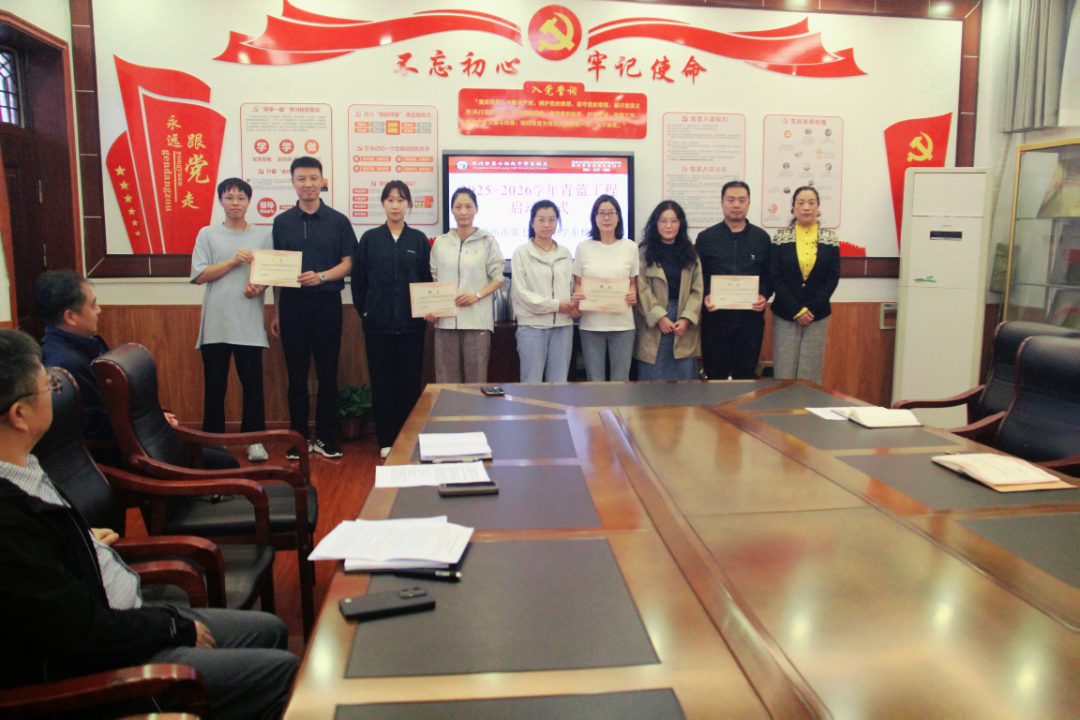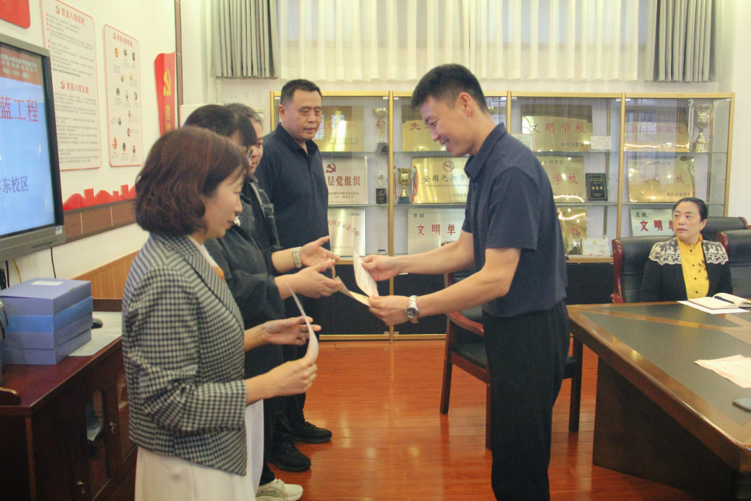 七初东校区副校长徐光辉为青蓝工程指导老师颁发聘书,学校特别邀请教育集团本部名师刘令加入指导团队。同时,为强化思想引领与专业提升,学校党支部创新实施“红帆导师”制度,由校领导一对一指导,以帮助青年教师形成符合新时期要求的观念与方法。