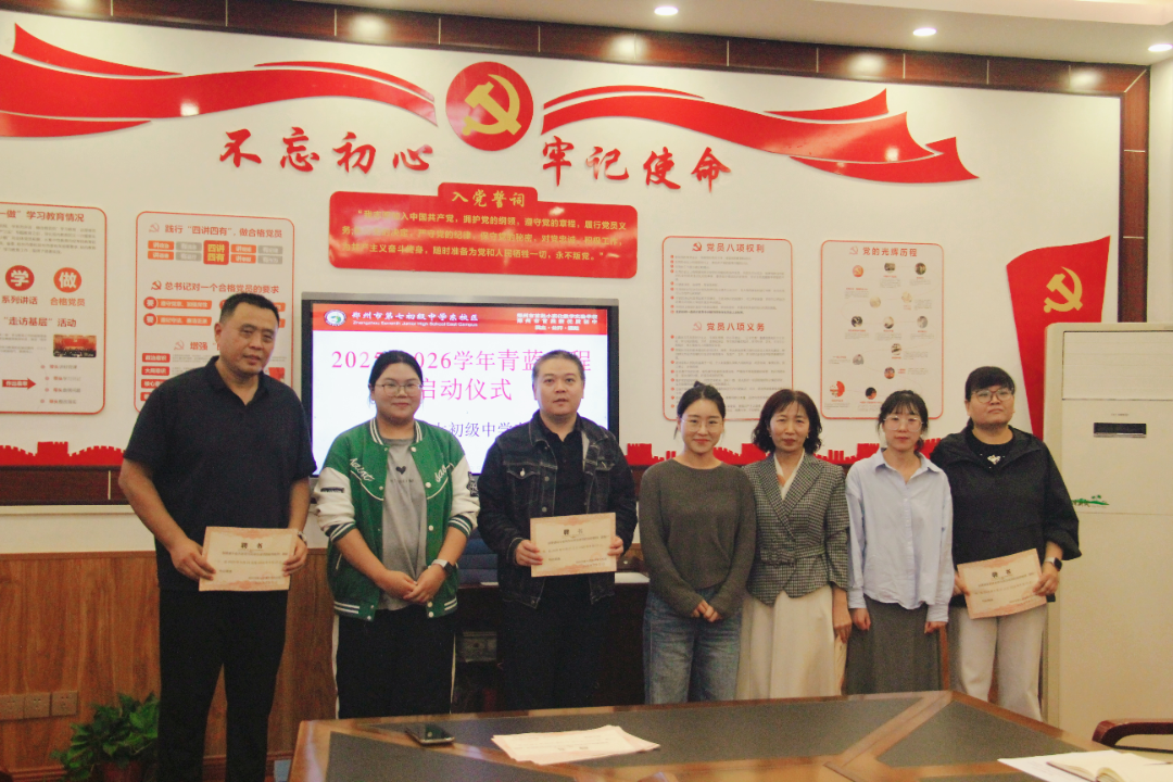 为促进青年教师专业成长,加强师资队伍建设,9月25日下午,郑州市第七初级中学东校区在学校一楼会议室隆重举行青年教师座谈会暨“青蓝工程”结对仪式。本次活动由七初东校区教科处主任张超主持,通过构建“师徒结对+红帆导师”双轨指导机制,助力青年教师全面发展。