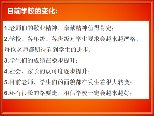 此外 ,楚书记分三天用三场报告的时间向七八九年级全体家长,分享了学校加入七中教育集团后取得的变化,楚书记肯定了七初东校区老师们的敬业精神,用视频的形式展示了七初东校区学子们在清晨入校、早读、课间跑等具体时段的精神面貌。楚书记讲到,学生的成绩在稳步提升,学校的社会认可度在稳步提升,未来学校一定会发展的越来越好。